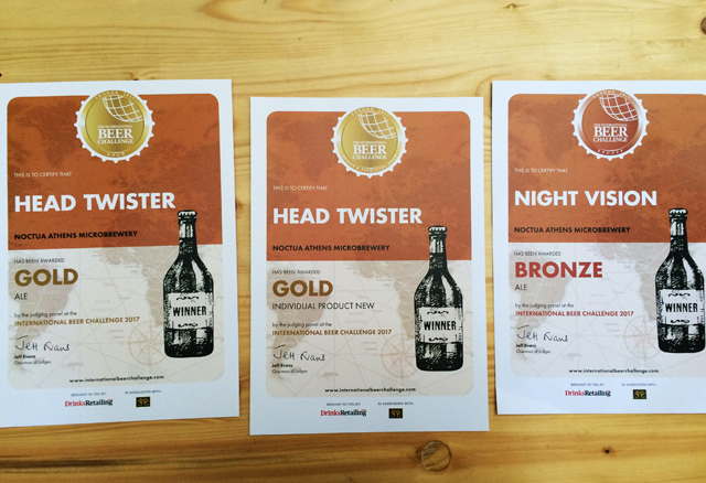 Μετά από γευστική δοκιμή που έγινε από εξειδικευμένους κριτές η Noctua Head Twister βραβεύτηκε με χρυσό στην κατηγορία Ale, ενώ η μαύρη IPA, η Noctua Night Vision κέρδισε χάλκινο μετάλλιο στην ίδια κατηγορία. Και έτσι, έμαθα ότι βγάλανε ακόμα μία μπίρα, τη Head Twister, η οποία και απέσπασε το χρυσό βραβείο στην κατηγορία design& packaging. Τα συγχαρητήρια, να τους τα δώσετε από κοντά. Το ζυθοποιείο τους είναι ανοιχτό σε όλους!