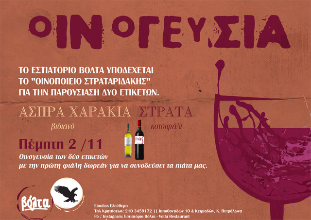 Όσοι βρεθούν την Πέμπτη στη Βόλτα θα έχουν τη δυνατότητα γευσιγνωσίας των δύο αυτών ετικετών. Μάλιστα, η πρώτη φιάλη της επιλογής σας θα είναι δωρεάν για να συνοδεύσετε τα πιάτα του μενού.