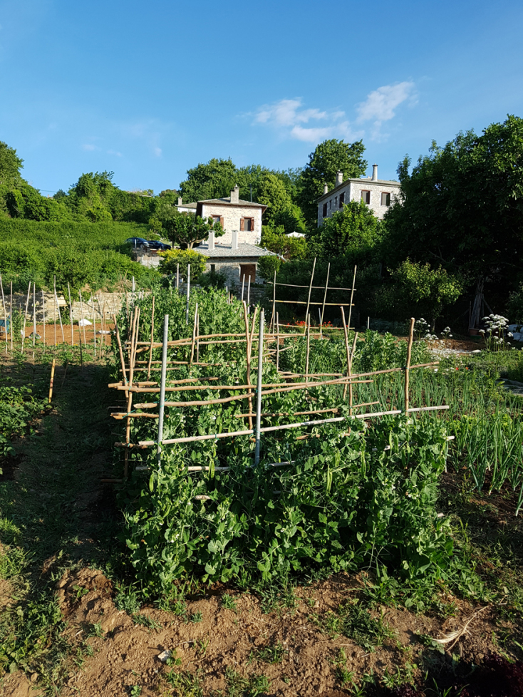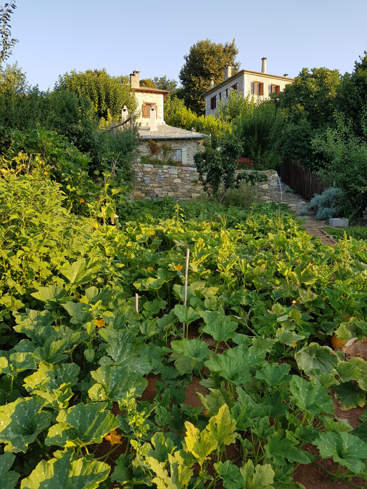 Για αυτούς τους λόγους επιλέξαμε οι καλλιέργειές μας να μην είναι εντατικής μορφής. Δεν είμαστε αγρότες, δεν βασιζόμαστε στην παραγωγή για να ζήσουμε. Αυτό από τη μια μας επιτρέπει να έχουμε χρόνο και για την τροφοσυλλογή και από την άλλη να μπορούμε άφοβα να πειραματιστούμε με ποικιλίες, να εξημερώνουμε άγρια φυτά και κυρίως να μην εκβιάζουμε τη γη να δώσει παραπάνω από όσο μπορεί. Καλλιεργούμε βιολογικά 80 οπωροφόρα, το βοτανόκηπο με 200 ρίζες βότανα και ένα μεγάλο μπαξέ με εποχιακά ζαρζαβατικά.