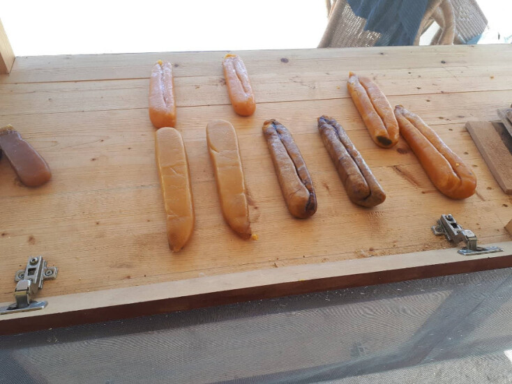 Μετά από λίγες μέρες, το παρασκεύασμα με το αυγοτάραχο, θα τοποθετηθεί ανάποδα για να στεγνώσει και η κάτω πλευρά του που βρίσκεται στον ξύλινο πυθμένα.