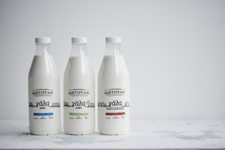 Πρωταρχική σημασία στο τυρί, έχει η πρώτη ύλη. Και η πρώτη ύλη εδώ έρχεται από επιλεγμένα κοπάδια ντόπιων φυλών ζώων που βόσκουν ελεύθερα. Ε, ήταν επόμενο να γίνει το επόμενο βήμα και αυτή η υπέροχη πρώτη ύλη να φτάσει στα χέρια μας. Πλέον λοιπόν στον Κωσταρέλο θα βρεις κατσικίσιο και αγελαδινό γάλα, που μάλιστα ειδικά για το κατάστημα στο Κολωνάκι χρησιμοποιείται τόσο στους καφέδες, όσο και στα ροφήματα. Στο σημείο αυτό θα ήθελα να σημειώσω ότι έχω πάθος με το γάλα, το πίνω πιο πολύ κι από το νερό. Πήρα όσα περισσότερα μπουκάλια μπορούσα να κουβαλήσω και πάλι δεν ήταν αρκετά.