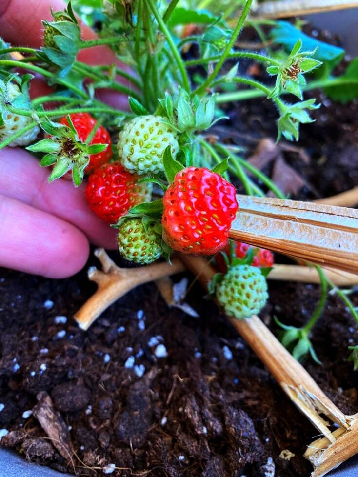 Έχω και τα δυο μου μικρά για βοηθούς, τους αρέσει πολύ. Ο μεγάλος -4 χρονών-, όλο και κάτι κάνει, ο μικρός -2,5 χρονών-, μας παίρνει από πίσω και είναι...ο μεγάλος καταστροφέας! Μόλις ξυπνάει τρέχει γραμμή στις φράουλες κι άμα δει να έχει βγει κανά μικρό φραουλάκι, τσουπ το κόβει και το τρώει!
