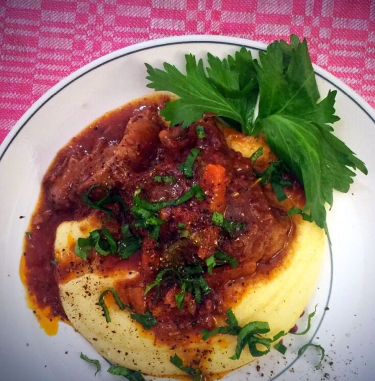 Κάτι κατάφερα, οπότε σας δίνω την κλασική εκδοχή της συνταγής, σερβιρισμένη με πολέντα δηλαδή έναν ζεστό χυλό-πουρέ από καλαμποκίσιο σιμιγδάλι, που η κάπως ουδέτερη γεύση του συνοδεύει άριστα τα φαγητά με σάλτσες.