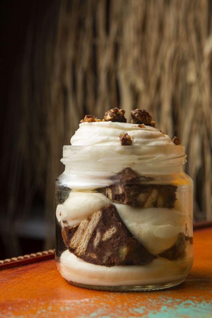 Ειδική μνεία αξίζει και στα δύο γλυκά: το αέρινο cheesecake με μους τυριού, κόκκινα φρούτα και μπισκότο κανέλας και το υπέροχο Μωσαϊκό με Ναμελάκα λευκής σοκολάτας, καφέ και πεκάν. Θυμίζει αόριστα το τιραμισού λόγω του καφέ, είναι όμως πολύ-πολύ καλύτερο χάρη στο γενναιόδωρα σοκολατένιο μωσαϊκό που βασίζεται στο αγαπημένο γλυκό των παιδικών χρόνων της Ελένης. «Είναι μια συνταγή της θείας μου, και μέχρι στιγμής η καλύτερη για μωσαϊκό που έχω φάει! Τα περισσότερα πιάτα τα δημιουργώ με αυτόν τον τρόπο, είναι εικόνες που είχα μεγαλώνοντας τις οποίες προσάρμοσα στις δικές μου γεύσεις».