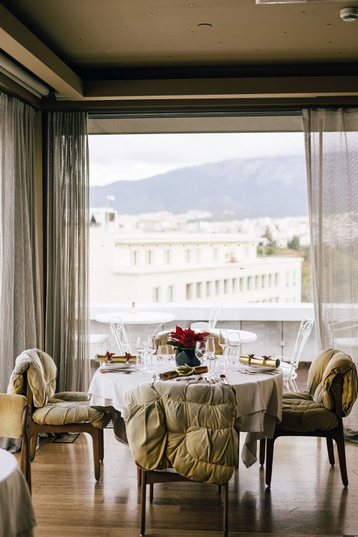 Retro αισθητική, 60s vibes και η φωτισµένη Ακρόπολη στο κάδρο. Το µενού των Χριστουγέννων περιλαµβάνει 4 πιάτα είναι €55/άτοµο, ενώ το µενού 4 πιάτων για το ρεβεγιόν της Πρωτοχρονιάς είναι στα €65/άτοµο. Παναγή Τσαλδάρη 1, Οµόνοια, 2144441300