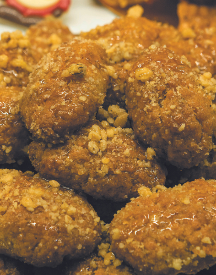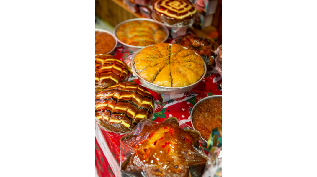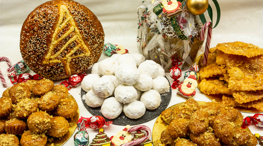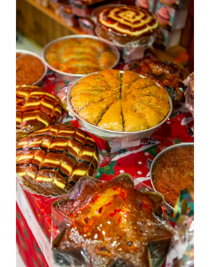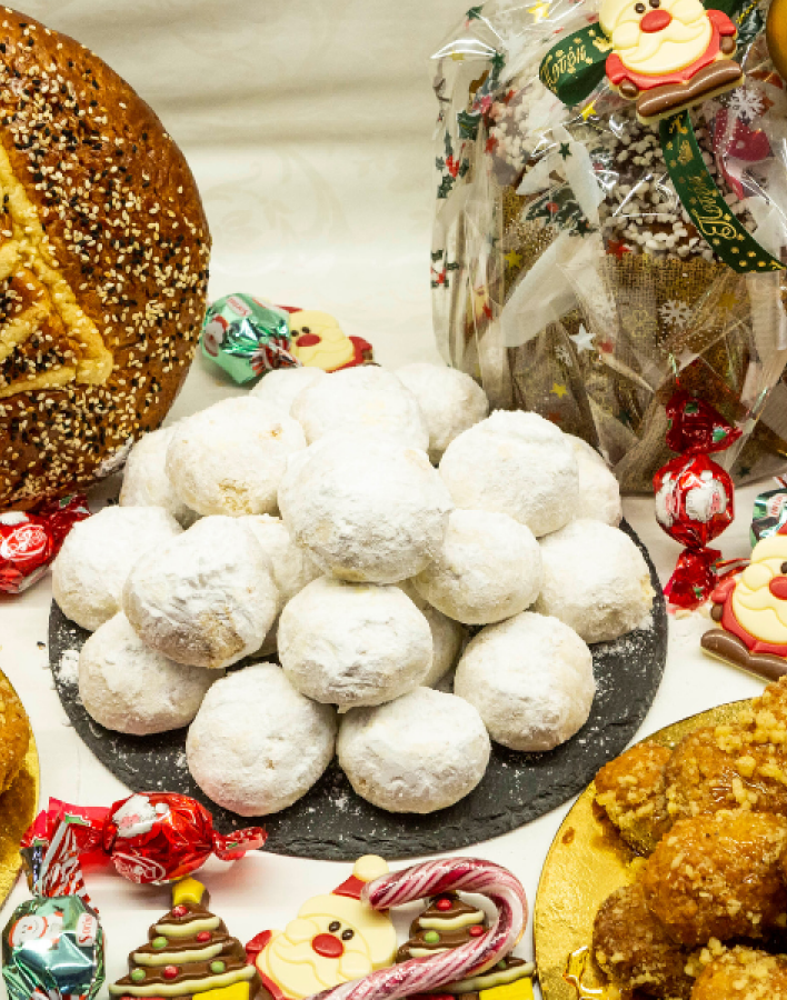 Αναμφισβήτητος πρωταγωνιστής των ημερών δεν είναι άλλος από τα φημισμένα μελομακάρονα, εκείνα τα μικρά γλυκά θαύματα, οι μπουκίτσες οι γεμιστές με καρύδι, που σίγουρα θα λατρέψετε! Ακόμα, φανταστικοί κουραμπιέδες με βούτυρο γάλακτος, πεντανόστιμες δίπλες, φοβεροί κορμοί και πανετόνε, υπέροχα σιροπιαστά, αλλά και το παραδοσιακό πολίτικο τσουρέκι με μαχλέπι και μαστίχα. Ό,τι μπορείτε να σκεφθείτε στα πιο γλυκά όνειρά σας! Φυσικά δεν θα μπορούσαν να λείπουν και οι βασιλόπιτες, τις οποίες θα βρείτε σε δύο εκδοχές: σε τσουρέκι πολίτικο και σε κέικ με σταφίδες και καρύδια και μαρέγκα από πάνω (μια βασιλόπιτα… υπερπαραγωγή!)