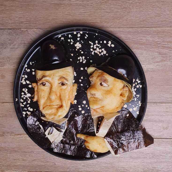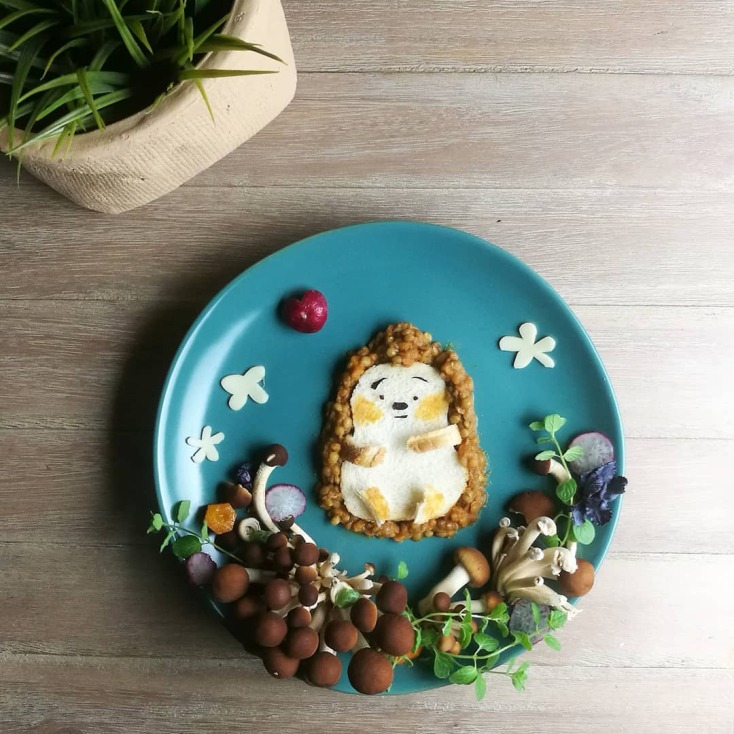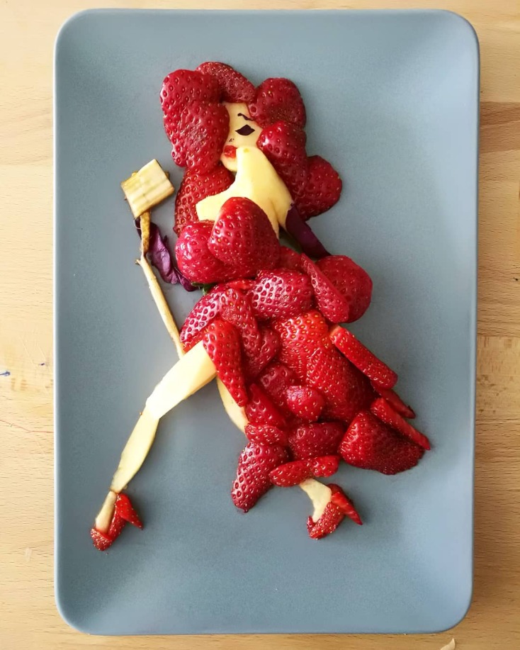 Όσον αφορά τα πιάτα μου, μπορεί να αγαπάω το ίδιο, ένα που είναι basic σε τεχνικές με κάποιο που ακολούθησε μετά από χρόνια εξάσκησης. Ξεχωρίζω την Τζέσικα Ράμπιτ από μήλο και φράουλες και τον σκατζοχοιράκο από ψωμί και φακή, που δεν είναι κάποιος γνωστός ήρωας καρτούν. Το κάθε πιάτο έχει το δικό του βαθμό δυσκολίας παρόλο που μπορεί να μην φαίνεται με την πρώτη ματιά σε κάποιον που τα συγκρίνει. Νομίζω έχω φτιάξει food art σε κάθε κατηγορία, πρωινό, σνακ, φαγητό, γλυκό, πίτα, σμούθι, σούπα, τοστ, αλλά και με κάθε υλικό που χρησιμοποιούμε στο καθημερινό μας τραπέζι.»