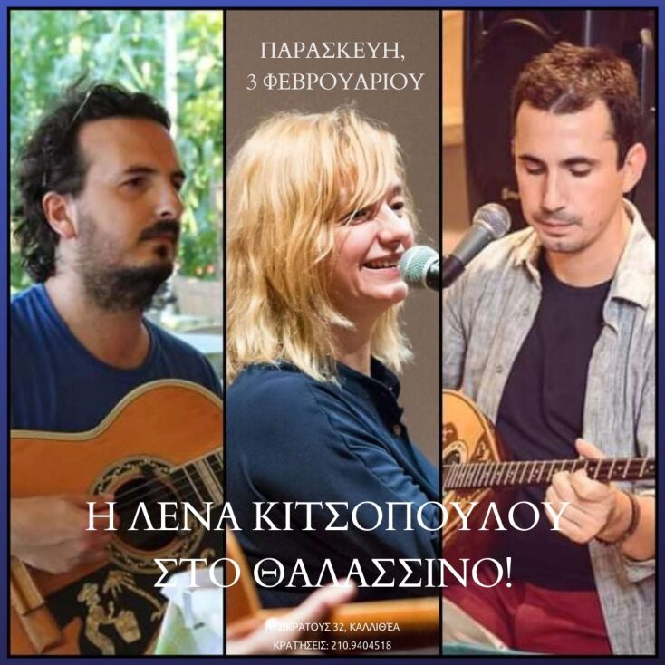 Το να κάτσεις μία ηλιόλουστη μέρα στην αυλή του Θαλασσινού για να μοιραστείς μαζί με καλούς φίλους όλες τις ψαρονοστιμιές του αποτελεί πάντα μία καλή ιδέα. Αλλά κάθε που ανοίγει το τριώδιο ο Θαλασσινός μας δίνει και μία ακόμη αφορμή για να τον επισκεφτούμε. Είναι οι ξακουστές πια μουσικές συναντήσεις του με τη Λένα Κιτσοπούλου, που έχουν γίνει ιδιαίτερα αγαπητές τα τελευταία χρόνια. Βραδιές που κυλάνε γεμάτες με κέφι, πολλά τραγούδια και μένουν αξέχαστες. Το ραντεβού δίνεται πάλι φέτος αυτή την Παρασκευή 3 Φεβρουαρίου, λίγο μετά τις 21.00. Στο τραγούδι η ξεσηκωτική φωνή της Λένας Κιτσοπούλου, στην κιθάρα ο Μπάμπης Παπαδημητρίου και στο μπουζούκι ο Στράτος Γκρίντζαλης. Όλοι μαζί, θα μας παρασύρουν με τα ρεμπέτικα και λαϊκά τραγούδια τους σε ένα χαρούμενο live, που σίγουρα θα θυμάσαι για καιρό.