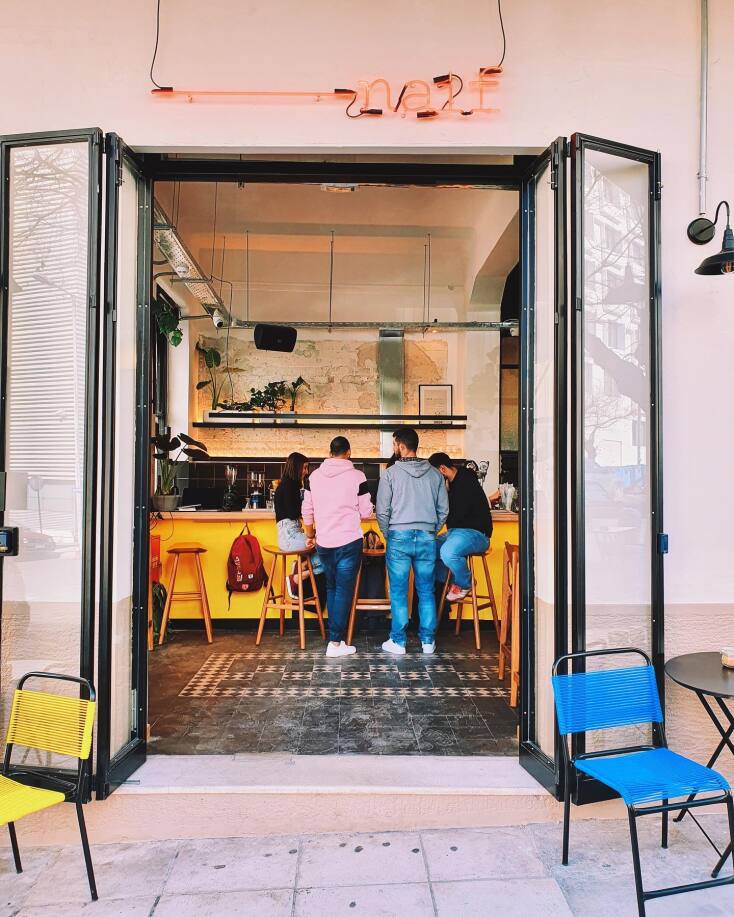 Τα εξωτερικά τραπεζάκια έχουν για θέα το ολόφωτο κτίριο της Στέγης Ιδρύματος Ωνάση από την πίσω (εξίσου εντυπωσιακή) πλευρά του. Αν περάσεις βιαστικά και ρίξεις μόνο μια ματιά, δεν πιάνεις ακριβώς τον λόγο που το Naif έγινε στέκι κατορθώνοντας να φέρει κόσμο σε αυτή την εκτός πιάτσας γειτονιά. Πρέπει να περάσεις λίγες ώρες εδώ, ακούγοντας τη μουσική, πίνοντας το ποτό (ή τον εξαιρετικό καφέ) σου, χαζεύοντας τις γύρω παρέες. Και όταν φας το πρώτο κομμάτι αχνιστής πίτσας, το συνειδητοποιείς: το Naif έγινε στέκι γιατί τα κάνει όλα άψογα. Από τον πρώτο καφέ, μέχρι το τελευταίο ποτό που θα σερβιριστεί, από το brunch μέχρι τις λαχταριστές πίτσες, ό,τι βγάζει η μπάρα ή η κουζίνα του είναι αψεγάδιαστο. Πρόσθεσε την ειλικρινά φιλική διάθεση, την όμορφη ατμόσφαιρα, την προσεκτικά διαλεγμένη μουσική και έχεις ένα στέκι που τους χωράει όλους κάθε ώρα και στιγμή. Λεοντίου 10 και Ευρυδάμαντος, Νέος Κόσμος, 210 9334946