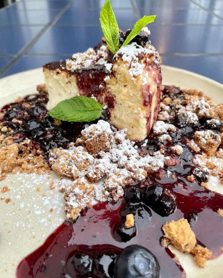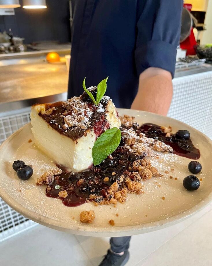 Το κοιτώ: κομψοτέχνημα από πλευράς εικόνας, το κρεμώδες και το βελούδινο βοούν πριν ακόμα το δοκιμάσουμε. Εικόνα για instagram, αλλά προκλητικά περιλουσμένο καθώς είναι με μαρμελάδα, μπισκότο και μύρτιλα, το τσακίζουμε με τα κουτάλια μας και γεύομαστε την καλοσύνη του: δέκα στα δέκα.