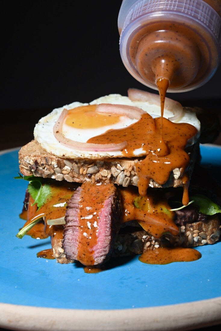 Το ίδιο συμβαίνει και όταν ο σεφ μετά το free style mix του ελληνικού πρωινού με φιλιππινέζικες ιδέες υλοποιημένες πάνω σε γιαπωνέζικα τηγάνια, αλλάζει γευστικό παράλληλο λανσάροντας ένα πιάτο μεξικάνικο: rib eye μοσχαρίσιο ελευθέρας βοσκής από τη φωτιά κατευθείαν μέσα σε προζυμένιο ψωμί, με τηγανητό αυγό, κόλιανδρο, πίκλες, coffiranca (σάλτσα καφτερή με βάση τον καφέ που της δίνει μια μαγική πικάντικη εσάνς), πίκλα και κόκκινο κρεμμύδι.