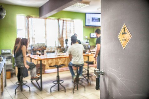 Ο Χρήστος με ξεναγεί στις 3 αίθουσες. Πριν ανοίξει την πρώτη πόρτα βάζει το δάχτυλο στα χείλη του «Σσσς» ψιθυρίζει «τώρα δίνουν εξετάσεις». Μπαίνουμε στις μύτες. Δυο αγόρια με ποδιές φτιάχνουν espresso με μεγάλη επιδεξιότητα και είναι τόσο προσηλωμένοι στη δουλειά τους, που σχεδόν δεν μας αντιλαμβάνονται. (σ. σ. η σχολή συνεργάζεται με την ACTA –τεχνοβλαστός του ΑΠΘ– και εκδίδει πιστοποιήσεις Barista κατόπιν εξετάσεων).
