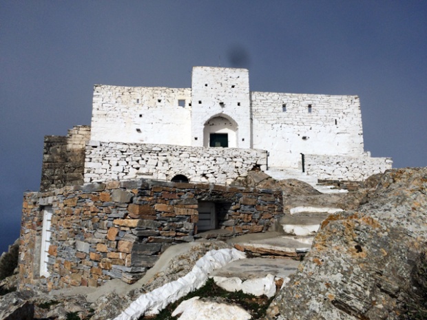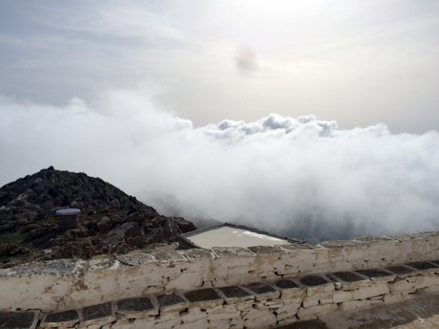 Τέτοιο θέαμα σκέφτομαι δεν μπορεί να το χάσω. Το μοναστήρι μέσα στην καταχνιά να το βλέπεις να κρέμεται σχεδόν, πάνω από το κεφάλι σου. Το κέφι μου φτιάχνει αμέσως. Περνάω την Απολλωνία και μπαίνω στον οικισμό της Καταβατής μέσα από πλακόστρωτο και αρχίζω να ακολουθώ τα άσπρα και κόκκινα σημάδια που έχουν βάλει οι Paths of Greece. Σε λίγο είμαι στο μονοπάτι και αρχίζει η ανάβαση. Πλακόστρωτο στο μεγαλύτερο μέρος του, παρ´ όλα αυτά όμως στεγνό προφανώς γιατί ειναι μακριά από την θάλασσα. Σκέφτομαι πόση δουλειά έχουν κάνει για να το φτιάξουν, αφανείς νησιώτες, ποιος ξέρει πότε, χωρίς κανένα προσωπικό όφελος και νιώθω ότι τους χρωστάω. Στο τρέξιμο νιώθεις πολύ συχνά ευγνωμοσύνη για πολλά. Γι αυτούς που συντηρούν τα μονοπάτια, για την καλή σου τύχη να μπορείς ακόμα να τρέχεις, για το τραγούδι που ακούς και μπορεί να σε κάνει να νιώσεις στιγμές απίστευτης ευφορίας, για την μοναδική θέα, για απρόσμενες συναντήσεις. Συνεχίζω ενώ το σύννεφο έχει καθίσει χαμηλά στην πεδιάδα στο πλάι μου. Το βλέπω σαν να είμαι σε αεροπλάνο, από ψηλά, ενώ από τα ανοίγματα οι ακτίνες του ήλιου φωτίζουν στο βάθος, τα βράχια της ακτής και σπαράγματα γαλάζιου του Αιγαίου.