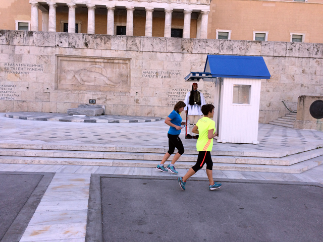Το ραντεβού με τη Σούλα και την Έιμι ήταν στις 8:30 στον «αριστερό τσολιά». Η ομάδα αυτό το Σαββατοκύριακο χωρίστηκε. Δεν είναι ποτέ εύκολο βλέπετε να συντονιστούν τόσα άτομα. Δουλειές, παιδιά για να μη θυμηθώ τις ιώσεις. Το Σάββατο λοιπόν Υμηττό τα «αγόρια», ο Στέφανος, ο Ρόμπερτ κι εγώ, καθώς ο Θανάσης έλειπε εκτός Αθηνών. Τρέξαμε 25 χιλιόμετρα με 800 υψομετρική σε 3 ώρες και σε καταπληκτικό καιρό. Γενικώς μάλλον ξεκούραστα, σιγά-σιγά η φυσική κατάσταση βελτιώνεται. Την Κυριακή τα «κορίτσια» θα ξεκινούσαν από το Μοσχάτο, μέσω του ποδηλατοδρόμου, και θα έφταναν κέντρο, Φιλοπάππου, Ακρόπολη, Σύνταγμα και πίσω. Μια διαδρομή 22 περίπου χιλιομέτρων (11+11) που την κάνουν συχνά, πολύ νωρίς το πρωί και τη συνδυάζουν με φρέσκα κουλούρια. Αυτή τη φορά ανέλαβα εγώ τον ανεφοδιασμό, υπολογίζοντας να κάνω και ένα περπατοτρέξιμο «αποκατάστασης» καθώς τα πόδια ήταν ακόμα σφιγμένα από το Σάββατο. Η δική μου διαδρομή Σύνταγμα, Διονυσίου Αρεοπαγίτου, Ακρόπολη και πίσω, το υπολογίζω, πάνω κάτω, 4 χιλιόμετρα.