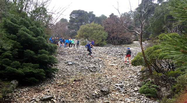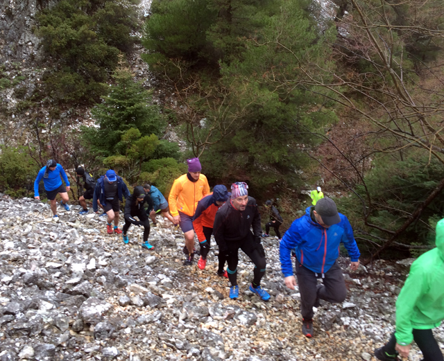 Πρώτος σταθμός στα δύο χιλιόμετρα περίπου μια μεγάλη σάρα με πολύ απότομη κλίση που, όπως μας λένε, όποιος θέλει μπορεί να δοκιμάσει να την ανέβει και να την κατέβει. Μια μικρή θάλασσα από θρυμματισμένες πέτρες. Όπου και να πατήσεις νιώθεις το έδαφος να φεύγει κάτω από τα πόδια σου. «Όποιος τρέχει στο ανέβασμα, μένει στο ίδιο σημείο» συμβουλεύει ο προπονητής. Πράγματι όσο πιο απότομες κινήσεις κάνεις τόσο υποχωρεί το έδαφος και γυρνάς πίσω. Ανεβαίνουμε όλοι. Όταν φτάνουμε κάπου στη μέση έρχεται η σειρά του κατεβάσματος. Για όποιον δεν το έχει κάνει ξανά μπορεί να είναι μια τρομακτική εμπειρία. Αισθάνεσαι ότι αν πέσεις θα βρεθείς στον πάτο του φαραγγιού. «Κρατάμε ισορροπία με τα χέρια» είναι εδώ η συμβουλή. Ο ένας μετά τον άλλο κατεβαίνουμε, τα πόδια βουλιάζουν στις πέτρες, γλιστράς αλλά συνεχίζεις, στο τέλος η εμπειρία είναι μέχρι και διασκεδαστική. «Ευτυχώς δεν χτύπησε κανείς» διαπιστώνει ο Γιώργος.
