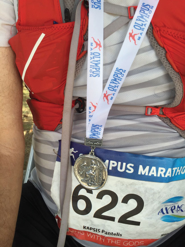 Η μεγάλη δυσκολία στον Όλυμπο ωστόσο είναι η κατηφόρα. Όταν περάσεις το οροπέδιο των Μουσών και τον περίφημο θρόνο του Δία, μπαίνεις στα Ζωνάρια και μια απότομη κατηφόρα, για περίπου 7 χιλιόμετρα, που σε διαλύει. Σαν να μη φτάνει αυτό, το έδαφος είναι χώμα με ψιλή πέτρα που γλιστράει διαολεμένα. Με πέρναγαν σαν σταματημένο οι άλλοι δρομείς κι όταν έφτασα στα Πριόνια, για πρώτη φορά σε αγώνα, δεν ήμουν βέβαιος αν θα αντέξω ως τον τερματισμό. Δεν ήταν τόσο η κούραση όσο ο πόνος σε γόνατα και ισχία. Τελικά τερμάτισα περπατώντας στα 2 τελευταία χιλιόμετρα, μαζί με μια άλλη εύθυμη πάντως παρέα δρομέων, καθώς συνειδητοποιούσαμε ότι παρά την εξάντληση θα τερματίσουμε εντός χρόνου.