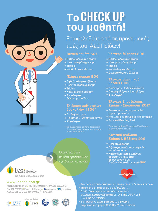 Το ΙΑΣΩ Παίδων με «Το CHECK UP του μαθητή!» προσφέρει ολοκληρωμένα πακέτα προληπτικών εξετάσεων υγείας για τα παιδιά, σε προνομιακές τιμές. Συμβάλλει στην πρόληψη και την καλή υγεία των μαθητών για τη νέα σχολική χρονιά!