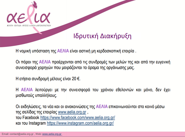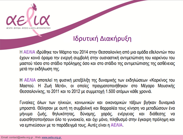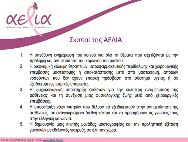 Η «ΑΕΛΙΑ» (MKO με έδρα τη Θεσσαλονίκη) συνεχίζει την εκστρατεία ενημέρωσης σε όλη την Ελλάδα, πραγματοποιώντας δράσεις -σε συνεργασία με τοπικούς φορείς- στοχεύοντας στην αφύπνιση των γυναικών για την προστασία της υγείας τους.