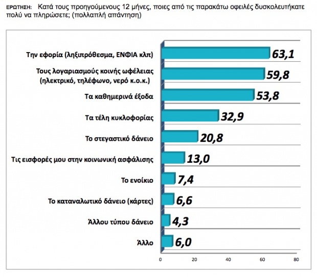 • Τέλος, το 63,1% δυσκολεύθηκε τον τελευταίο χρόνο πολύ να αποπληρώσει την εφορία, το 59,8% δυσκολεύθηκε πολύ να αποπληρώσει τους λογαριασμούς των ΔΕΚΟ, το 53,8% δυσκολεύθηκε πολύ να ανταπεξέλθει στα καθημερινά έξοδα, το 32,9% στα τέλη κυκλοφορίας, το 20,8% στο στεγαστικό δάνειο, το 13% στις εισφορές στην κοινωνική ασφάλιση, το 7,4% στο ενοίκιο και το 6,6% των ερωτηθέντων δυσκολεύθηκε πολύ να ανταπεξέλθει στις δόσεις του καταναλωτικού δανείου.