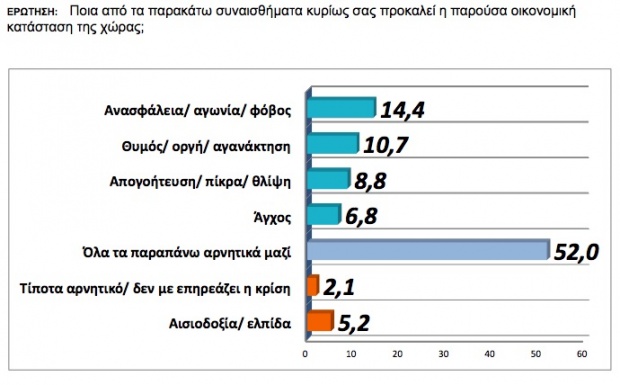 • Σύμφωνα με τα ευρήματα της μεγάλης έρευνας της ΕΣΔΥ, λοιπόν, το 52% των ερωτηθέντων δηλώνει ότι βιώνει ταυτόχρονα μία μεγάλη γκάμα αρνητικών συναισθημάτων, όπως ανασφάλεια, αγωνία, φόβο, θυμό, αγανάκτηση, οργή, απογοήτευση πίκρα, θλίψη και άγχος, ενώ μόλις το 5,2% των ερωτηθέντων αναφέρει ότι βιώνει τα συναισθήματα της αισιοδοξίας και της ελπίδας και το 2,1% δηλώνει ότι δεν επηρεάζεται από την κρίση.
