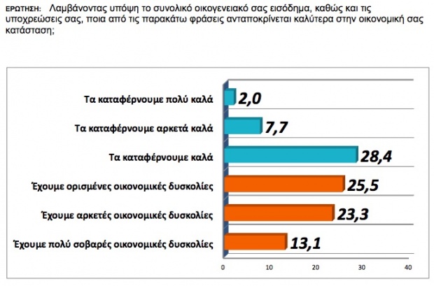 • Όμως, δεν είναι καθόλου ευκαταφρόνητο το 28,4% των ερωτηθέντων, το οποίο δηλώνει ότι τα καταφέρνει καλά με τα οικονομικά του, ενώ το 7,7% των ερωτηθέντων δηλώνει ότι τα καταφέρνει αρκετά καλά και το 2% πολύ καλά…