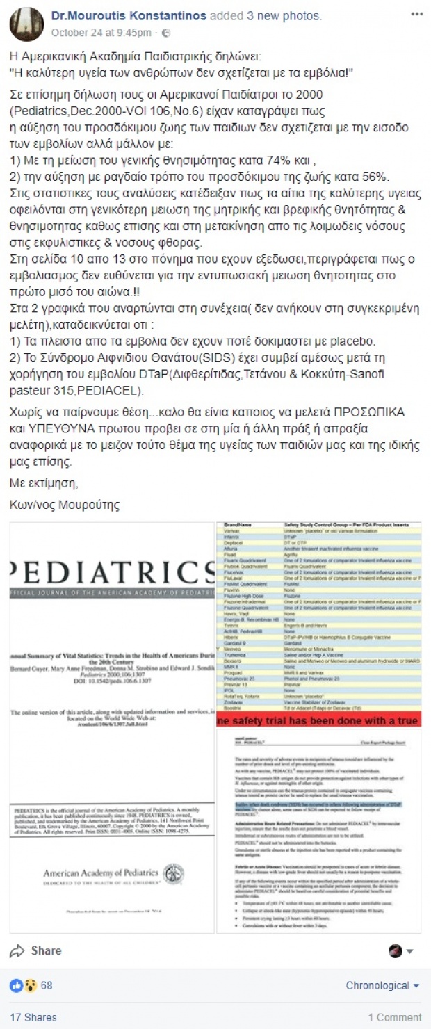 Ο «Δρ» Μουρούτης διαδίδει (προφανώς εις γνώσιν του) ψεύδη, ισχυριζόμενος πως «Η Αμερικανική Ακαδημία Παιδιατρικής δηλώνει: Η καλύτερη υγεία των ανθρώπων δεν σχετίζεται με τα εμβόλια!»
