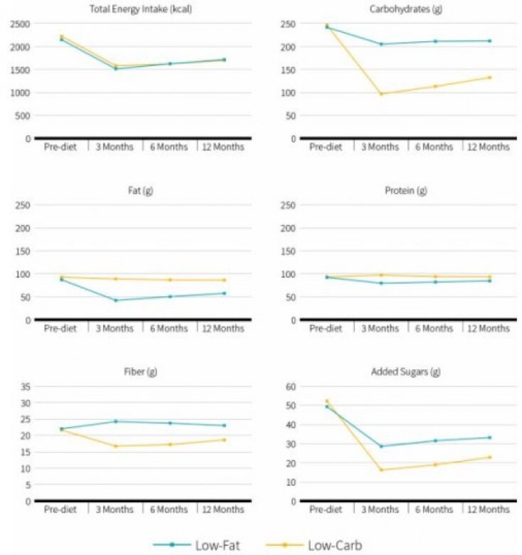 Ενώ δεν υπήρχαν σημαντικές διατροφικές διαφορές μεταξύ των δύο ομάδων πριν ξεκινήσουν οι διαιτητικές παρεμβάσεις, υπήρξαν σημαντικές διαφορές στους μήνες 3, 6 και 12 όσον αφορά την πρόσληψη υδατανθράκων, λιπών, πρωτεϊνών, φυτικών ινών και προστιθέμενων σακχάρων. Επιπλέον, η πρόσληψη κορεσμένου λίπους μειώθηκε σημαντικά στην ομάδα των χαμηλών λιπαρών, ενώ ο γλυκαιμικός δείκτης ήταν χαμηλότερος στην ομάδα των χαμηλών υδατανθράκων.