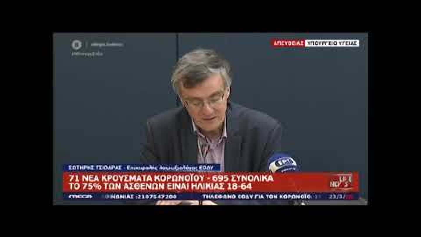 Σε 695 ανέρχονται συνολικά τα κρούσματα του κορωνοϊού στην Ελλάδα, καθώς καταγράφηκαν 71 νέα κρούσματα, σύμφωνα με τον εκπρόσωπο του υπουργείου Υγείας για τον κορωνοϊό Σωτήρη Τσιόδρα.