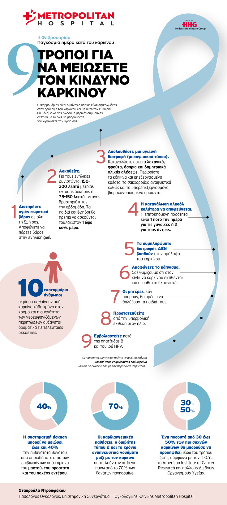 Διεθνώς αφιερωμένος στην πρόληψη του καρκίνου, στο σταμάτημά του πριν αυτός αρχίσει, είναι ο Φεβρουάριος. Μα, «μπορεί να υπάρξει θεραπεία πριν υπάρξει ασθένεια;» θα μπορούσατε να δικαιολογημένα να ρωτήσετε. Η απάντηση της επιστημονικής κοινότητας θα σας εκπλήξει: «μπορεί». Για την ακρίβεια όχι μόνο μπορεί αλλά και ίσως αποτελεί την καλύτερη θεραπεία από όσες γνωρίζουμε μέχρι στιγμής για τη νόσο. Είναι μια θεραπεία απλή, οικονομική, αποδεδειγμένα αποτελεσματική -η μείωση του κινδύνου εμφάνισης καρκίνου φτάνει μέχρι και το 50%- και το κυριότερο, είναι στο χέρι σας, αναφέρει η κ. Σταυρούλα Ντρουφάκου, Παθολόγος-Ογκολόγος, Επιστημονική Συνεργάτιδα Γ΄ Ογκολογικής Κλινικής Metropolitan Hospital.