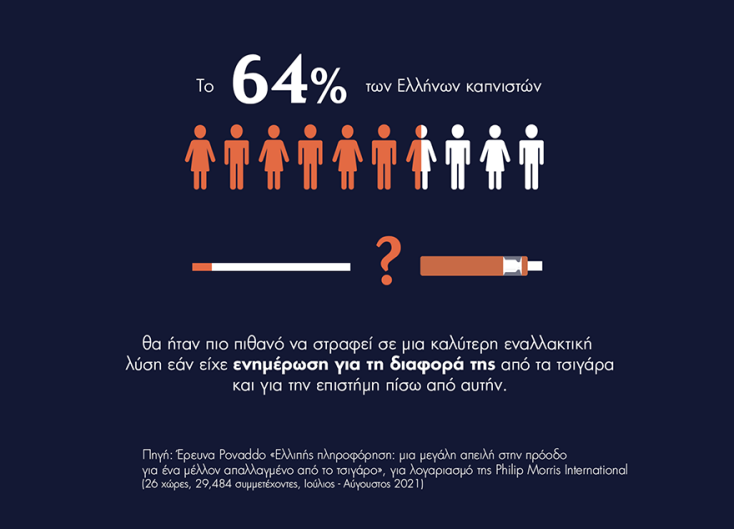 - 9 στους 10 καπνιστές παγκοσμίως που έχουν κάνει την αλλαγή σε μια καλύτερη εναλλακτική σε σχέση με το τσιγάρο αποδίδουν αυτή την απόφασή τους στην ακριβή πληροφόρηση που είχαν. Στο 86% είναι το αντίστοιχο ποσοστό για την Ελλάδα.