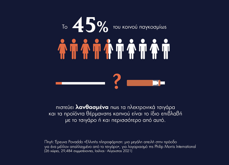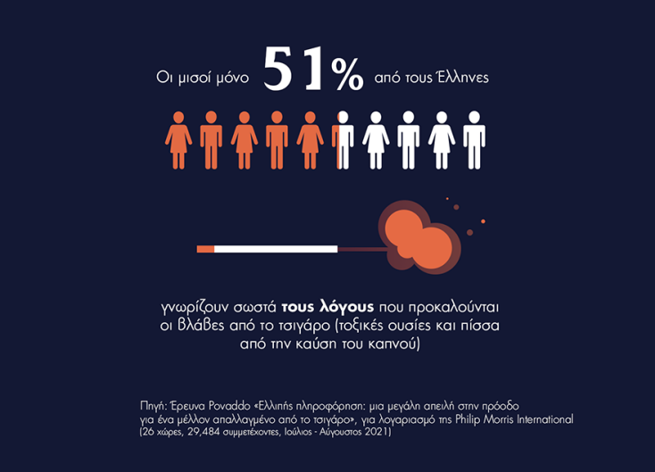 Η έρευνα με τίτλο «Ελλιπής πληροφόρηση: μια μεγάλη απειλή στην πρόοδο για ένα μέλλον απαλλαγμένο από το τσιγάρο» (Misinformation: A major threat to smoke-free progress) δείχνει συγκεκριμένα πως όταν το κοινό στην Ελλάδα κλήθηκε να προσδιορίσει την κύρια αιτία ασθενειών που σχετίζονται με το κάπνισμα, μόλις το 18% αναγνώρισε σωστά το υψηλό επίπεδο τοξικών ουσιών και το 33% την πίσσα που προκαλούνται από την καύση του καπνού. Ακόμη μικρότερο είναι το ποσοστό (41%) στο παγκόσμιο δείγμα όσων απάντησαν σωστά (δηλαδή, τοξικές ουσίες και πίσσα από την καύση του καπνού) σε αυτή την ερώτηση.