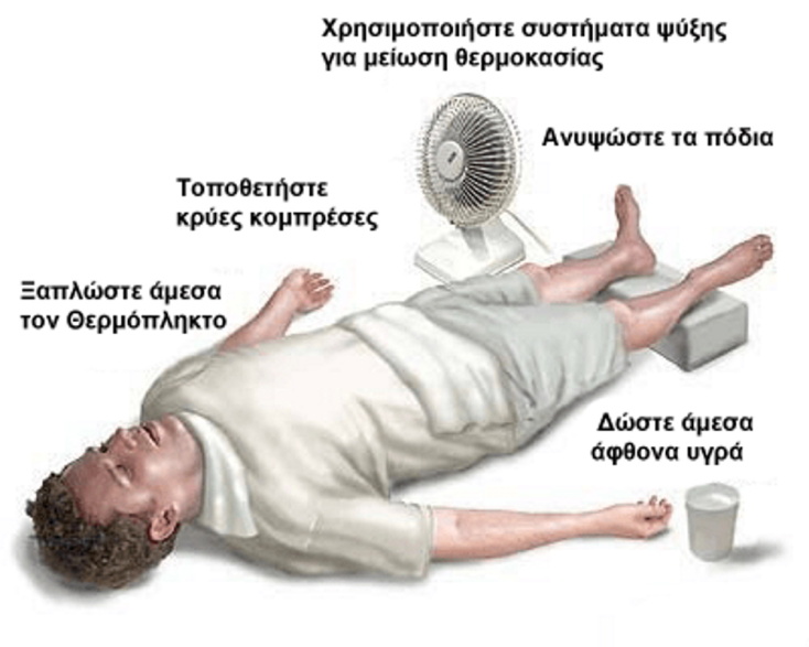 - Γρήγορα μειώστε τη θερμοκρασία του σώματος: βάλτε τον ασθενή σε μπανιέρα με κρύο νερό, ή βρέξτε το πρόσωπό του, το λαιμό, το στήθος και γενικά το σώμα του με κρύο νερό