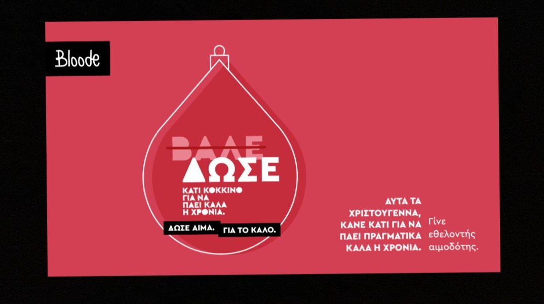 Το bloode, με μία Χριστουγεννιάτικη καμπάνια που «πατάει» σε αυτό ακριβώς το insight, αποσκοπεί στο να ευαισθητοποιήσει το κοινό ώστε να αυξηθεί ο αριθμός των αιμοδοσιών αυτές τις γιορτινές μέρες.