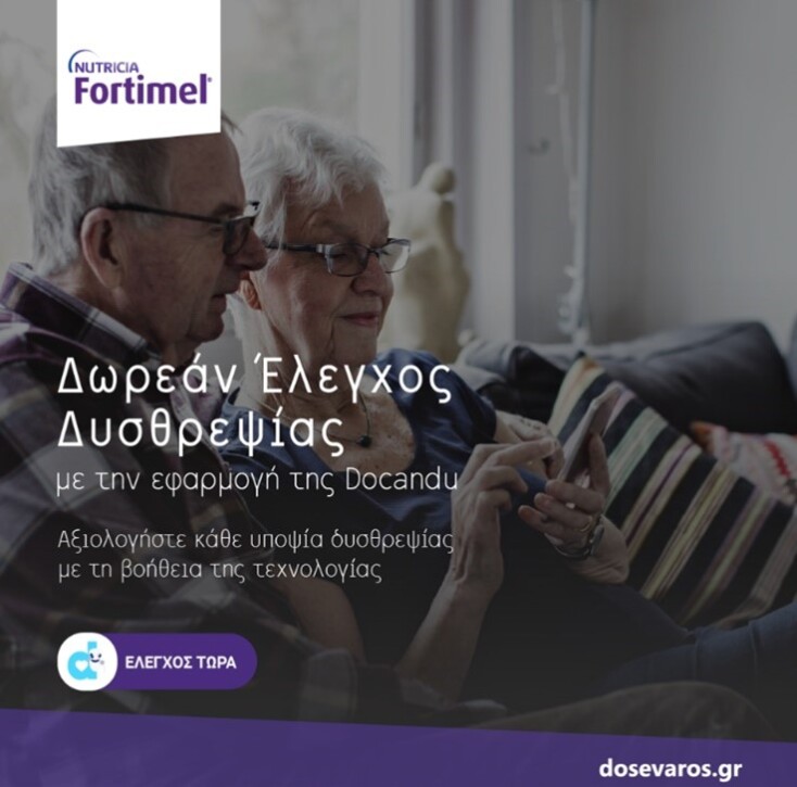Μέσω μία έξυπνης και απλής ηλεκτρονικής εφαρμογής, το Fortimel της NUTRICIA συνεργάζεται με την εταιρεία Docandu για παροχή δωρεάν ελέγχου δυσθρεψίας και παροτρύνει το κοινό να «ΔΩΣΕΙ ΒΑΡΟΣ ΣΤΑ ΣΗΜΑΔΙΑ», σε μία προσπάθεια ευασθητοποίησης και ενημέρωσης.