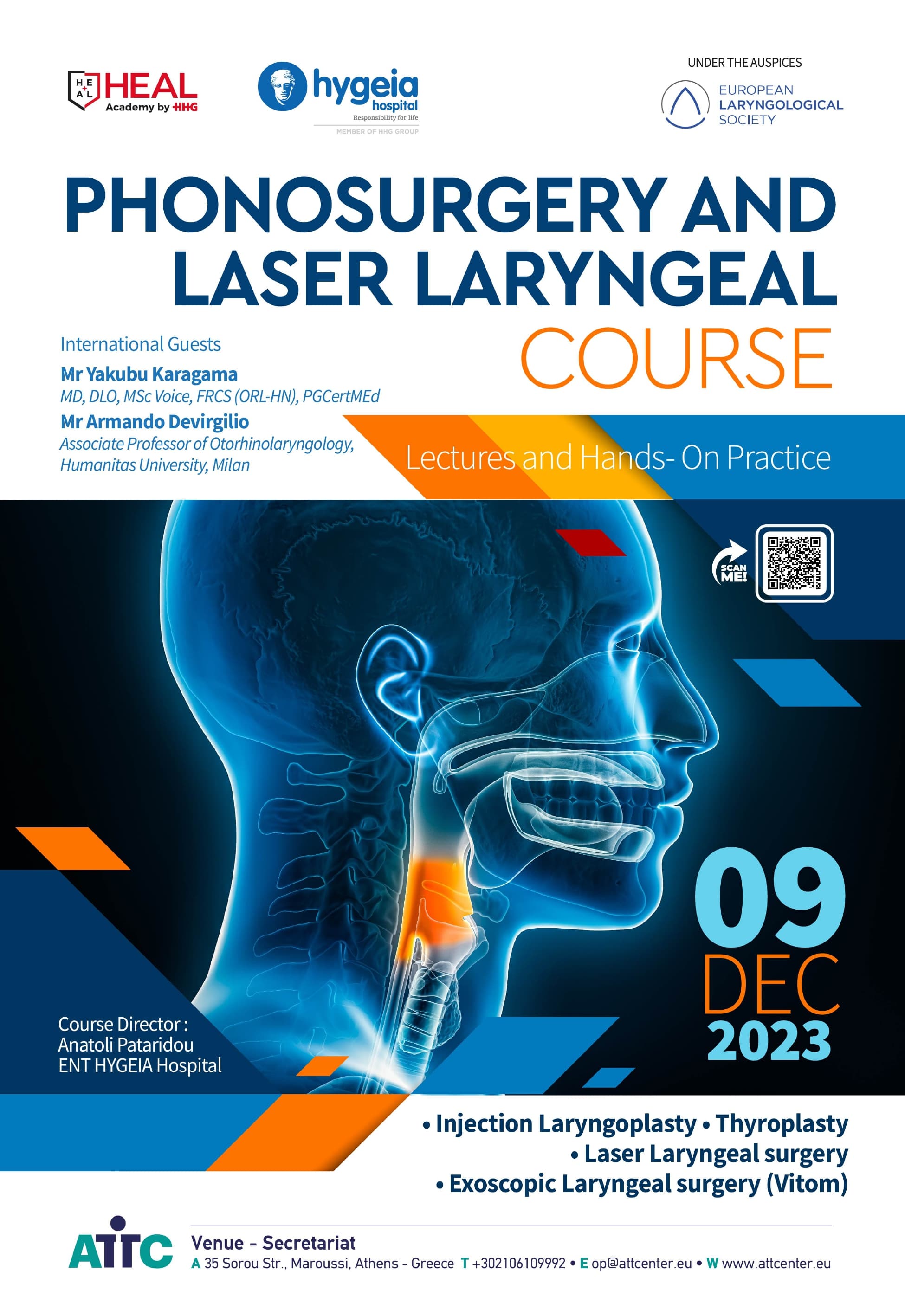 Το Workshop θα διεξαχθεί στο ATTC CENTER στις 9 Δεκεμβρίου 2023 και τελεί υπό την αιγίδα του Νοσοκομείου ΥΓΕΙΑ (της HEAL ACADEMY by HHG) και της Ευρωπαϊκής Λαρυγγολογικής Εταιρείας (ELS). Θα συμμετάσχουν διεθνώς διακεκριμένοι επιστήμονες και θα ανακοινωθούν ευρήματα μελετών πάνω στην εφαρμογή των νέων τεχνικών στο χειρουργείο.