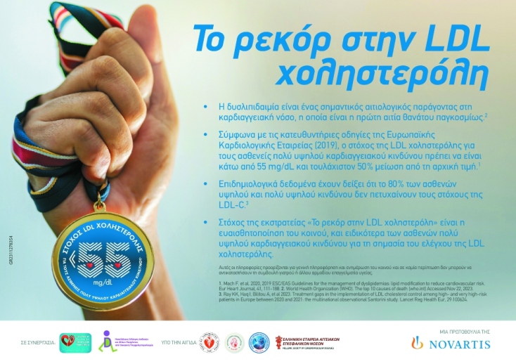 Αναγνωρίζοντας αυτή την ακάλυπτη ανάγκη, η νέα εκστρατεία της Novartis Hellas καλεί τους ασθενείς να «πετύχουν το ρεκόρ τους» και να μειώσουν τα επίπεδα της LDL χοληστερόλης τους ώστε να περιορίσουν τον κίνδυνο καρδιαγγειακών συμβαμάτων.