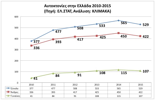 Συγκεκριμένα, οι θάνατοι από αυτοκτονία για το 2015 ανήλθαν σε 529 έναντι του 2014 που είχαν καταγραφεί 565.