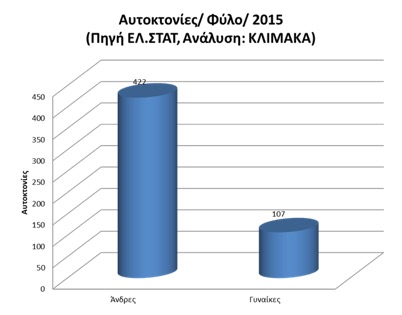 Σε κάθε μία αυτοκτονία γυναίκας αντιστοιχούν 4 αυτοκτονίες αντρών. Πιο συγκεκριμένα ο δείκτης αυτοκτονιών ήταν 8,1 ανά 100.000 για τους άντρες και 1,91 ανά 100.000 για τις γυναίκες.
