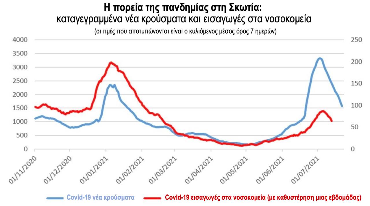 «Στη Σκωτία έχει αρχίσει να υποχωρεί η επίπτωση της παραλλαγής Δέλτα. Οφείλεται αυτό στο γεγονός ότι δεν γίνονται πλέον πολλά τεστ; Μάλλον όχι, γιατί ταυτόχρονα με τα νέα κρούσματα (μπλε γραμμή) πέφτουν και οι εισαγωγές στα νοσοκομεία (κόκκινη γραμμή)», σημειώνει ο καθηγητής.