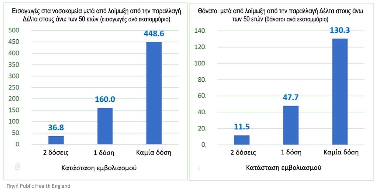 Σε προηγούμενη ανάρτησή του ο κ. Μοσιάλος αναφέρει: «Με βάση τα πρόσφατα στοιχεία του Οργανισμού Δημόσιας Υγείας της Αγγλίας, δυστυχώς φαίνεται πως οι ανεμβολίαστοι απειλούνται περισσότερο από την παραλλαγή “Δέλταˮ σε σχέση με τους εμβολιασμένους. Όπως φαίνεται στα στοιχεία που ανακοινώθηκαν και παρατίθενται στα γραφήματα, οι ανεμβολίαστοι άνω των 50 έχουν 11-12 φορές μεγαλύτερες πιθανότητες να νοσηλευθούν ή να πεθάνουν μετά από λοίμωξη από την παραλλαγή Δέλτα του ιού, σε σύγκριση με τους πλήρως εμβολιασμένους. Η επιλογή είναι προσωπική αλλά αυτά είναι τα στοιχεία, και είναι διαθέσιμα σε όλους», καταλήγει.