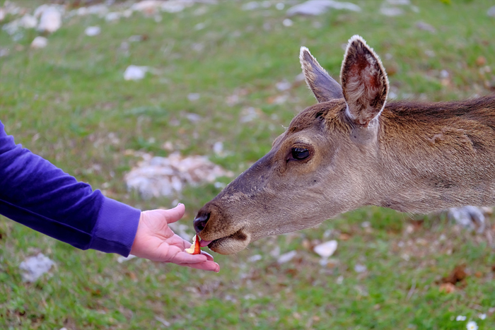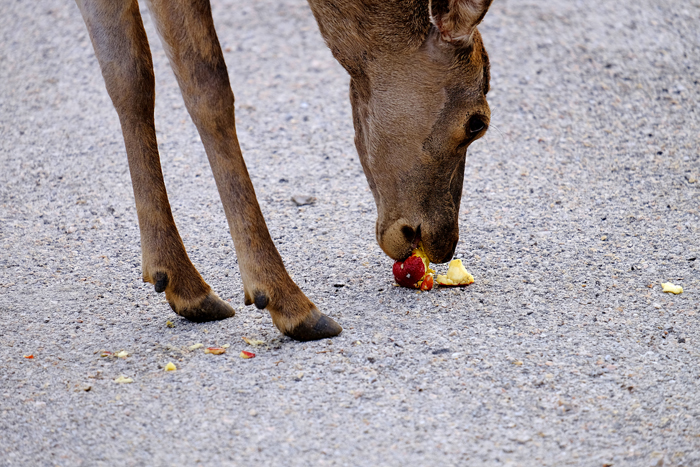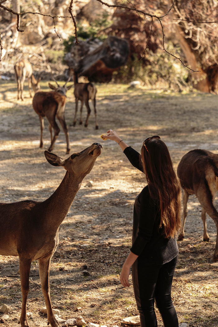Το να βρει καταρχάς κάποιος ελάφι να τριγυρνά παραμένει δύσκολη υπόθεση. Χρειάζεται υπομονή, επιμονή και στρατηγική. Είχα την τύχη τρεις από τις πολλές φορές που προσέγγισα το βουνό να συναντήσω αυτά τα πανέμορφα ζώα! Το πρώτο σημείο στο οποίο τα συνάντησα ήταν το Πάρκο των Ψυχών στο εγκαταλελειμμένο Σανατόριο της Πάρνηθας. Οι περιοχές γύρω είναι γυμνές από τις καταστροφές, παρόλα αυτά συνάντησα ελάφια να ψάχνουν να βρουν πράσινο, νερό ή κάποιο σημείο το οποίο θα θύμιζε το παλιό τους σπίτι (μέχρι πριν τις μεγάλες καταστροφές). Δυστυχώς αντίκρισα μια κατάσταση, αν μη τι άλλο, απογοητευτική και το θέαμα ήταν λυπηρό. Ελάφια διάσπαρτα να ψάχνουν για τροφή, για μια όαση, για φαγητό. Αυτό που μου έκανε ιδιαίτερη εντύπωση και με συγκίνησε ήταν το γεγονός πως παρόλη τη μεγάλη καταστροφή που έχουν υποστεί από εμάς κατά κύριο λόγο, αν έχουμε υπομονή, σεβασμό και λίγη τύχη, μπορεί και να πλησιάσουν πολύ κοντά. Τόσο ώστε όχι μόνο μπόρεσα να τα φωτογραφίσω από πιο κοντινή απόσταση αλλά και να τα ταΐσω! Αυτό συνέβη πρώτα κοντά στο παλιό καταφύγιο λίγο μετά το Πάρκο των Ψυχών, και έπειτα, όχι πολύ μακριά, σε ένα κομβικό σημείο από όπου ξεκινά μονοπάτι για πεζοπορία! Αρέσκονται πολύ στα φρούτα και τα λαχανικά!
