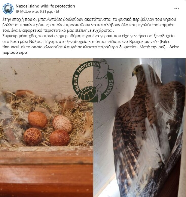 Σύμφωνα με την περιβαλλοντική οργάνωση Naxos Wildlife που δραστηριοποιείται στη Νάξο, ένα ξενοδοχείο στο νησί κρατά κλειστό ένα παράθυρο δωματίου για να μην ενοχλήσει ένα γεράκι να κλωσήσει τα αυγά του, τη στιγμή που η τουριστική περίοδος έχει ξεκινήσει στο νησί.