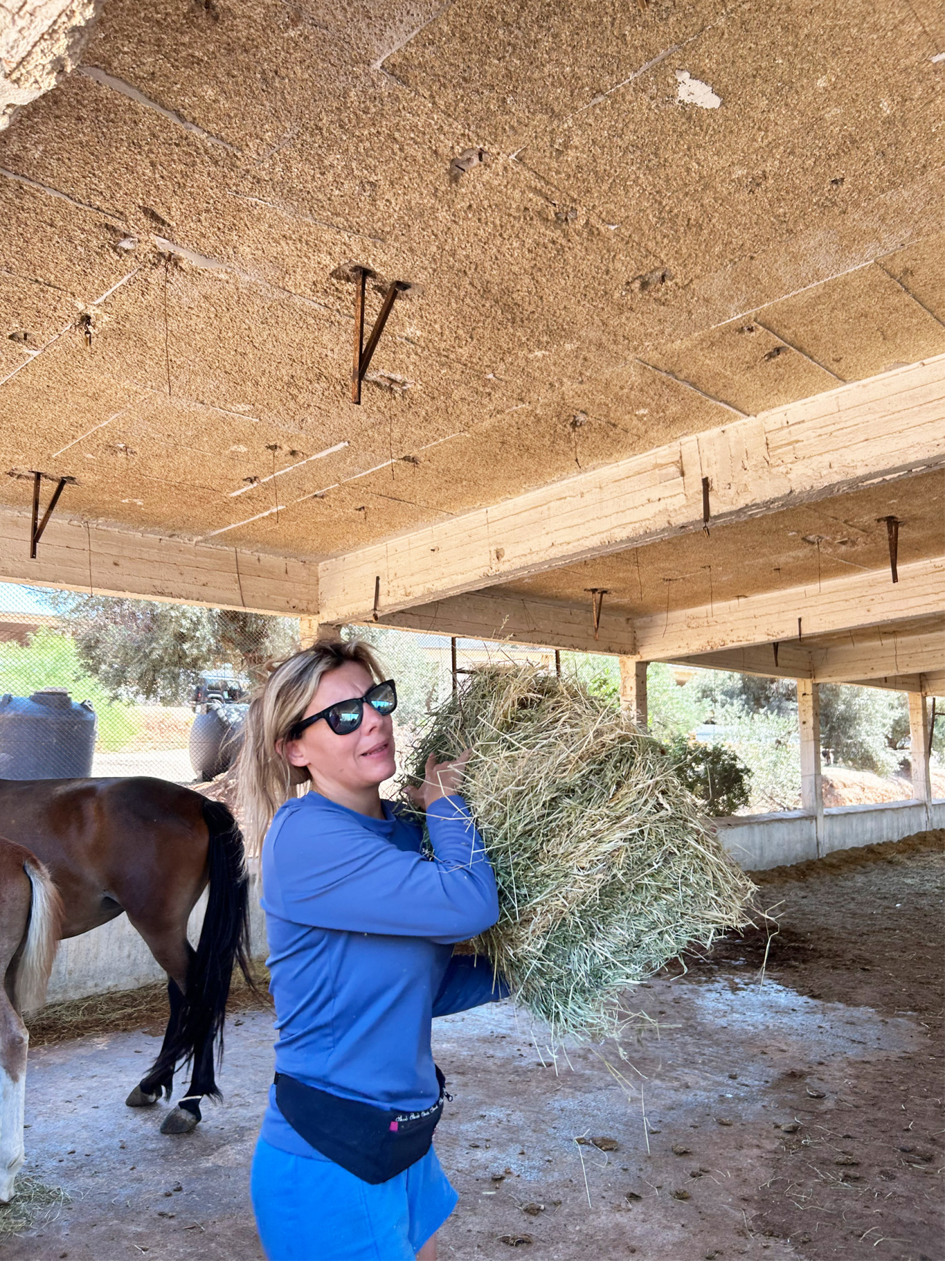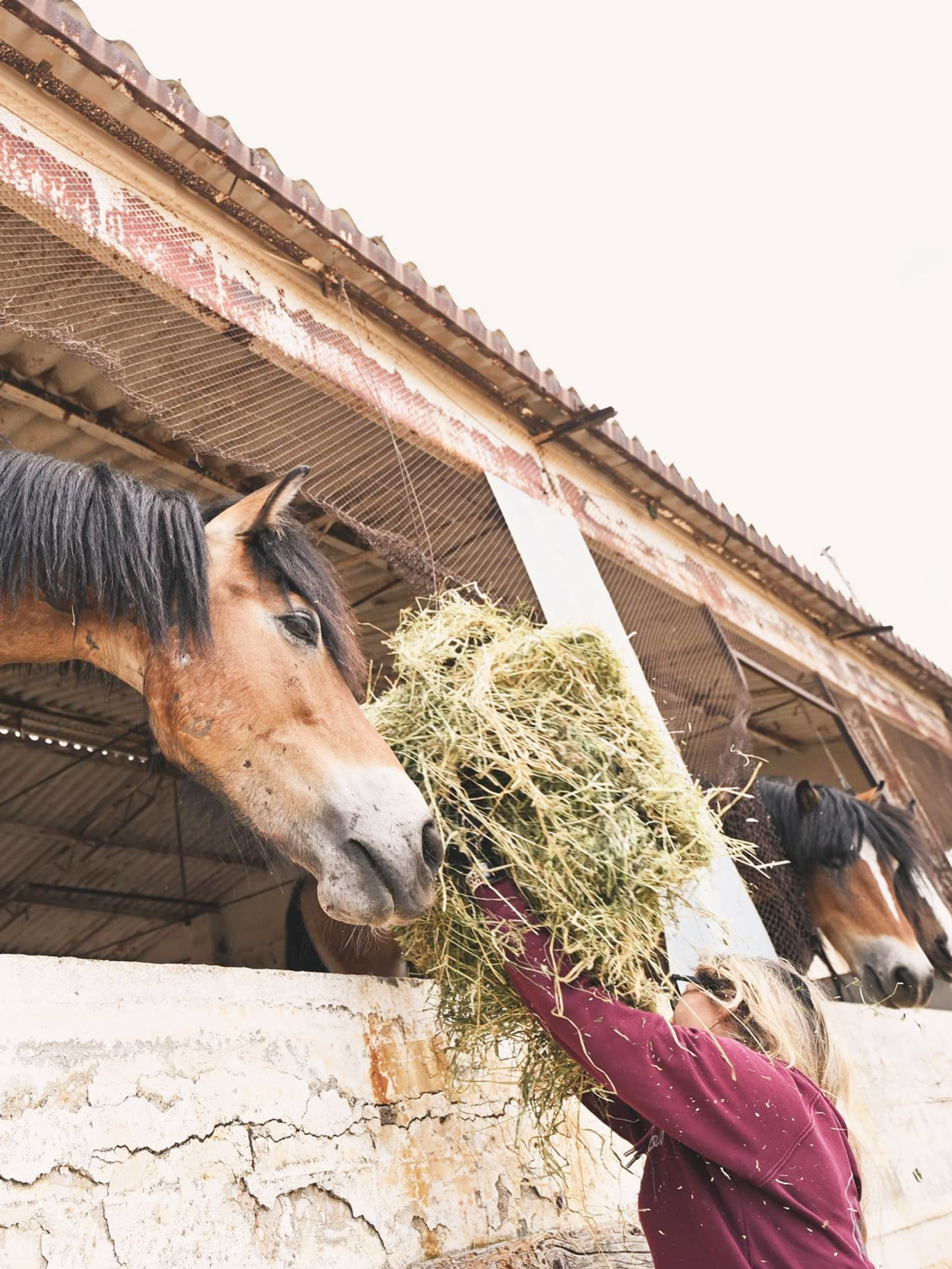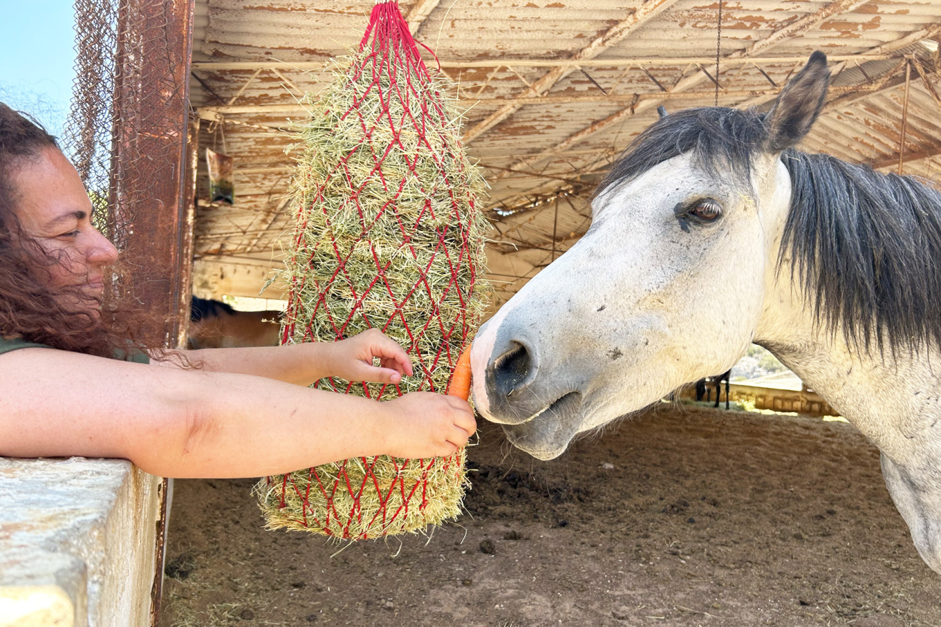 Κουβαλάνε τις μπάλες με άχυρο, πλένουν κουβάδες, βάζουν νερά, μαζεύουν κοπριές, τους δίνουν καρότα, τα χαϊδεύουν. Έχουν αναπτύξει τρυφερή σχέση με τα ζώα. «Όταν είσαι μαζί τους αντιλαμβάνονται αμέσως το πώς αισθάνεσαι. Η σχέση με τα άλογα είναι θεραπευτική, σε ηρεμούν πάρα πολύ» λένε και σκέφτομαι σε πόσους ανθρώπους θα έκανε καλό να έρχονται εδώ και να προσφέρουν. Η Μαρία συχνά φτάνει σε σημεία κατάρρευσης αλλά έχει δίπλα της την ομάδα που τη στηρίζει και καθημερινά και όλοι μαζί δίνουν μία μεγάλη μάχη για όλα αυτά τα υπέροχα πλάσματα.