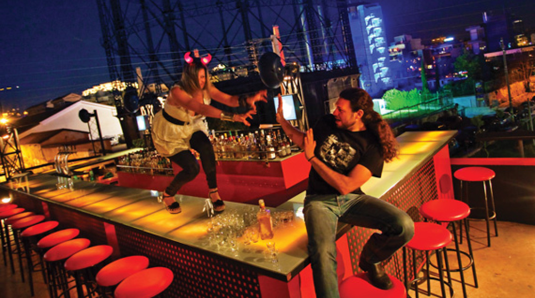 «Το “45 Μοίρες” οδηγεί την καλοκαιρινή διασκέδαση στο Γκάζι. Όσοι πιστεύουν ότι το mainstream και το εναλλακτικό είναι must, μάλλον δεν έχουν επισκεφτεί την ταράτσα μας. Εδώ σκληροπυρηνικοί αλλά και αλτέρνατιβ τύποι ανακαλύπτουν διασκεδάζοντας τα κοινά τους σημεία… γιατί κατά βάθος όλοι είμαστε ροκ! (Ο Λ. Μπ. είναι manager, στη φωτό με τη Χριστίνα Καραδουμάνη)