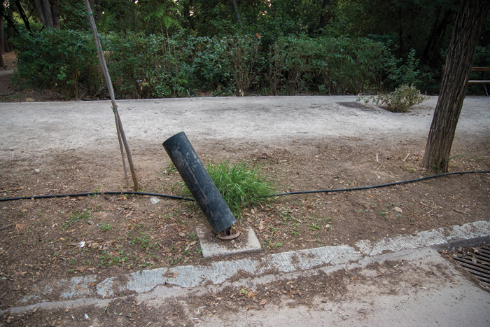 «Το πιο σημαντικό πρόβλημα είναι η φύλαξη. Ένα παιδάκι να χαθεί, δεν υπάρχει ένας άνθρωπος στον οποίο να μπορείς να απευθυνθείς» λέει η Ελισάβετ Αντωνιάδου. Δύο μηχανές της αστυνομίας ήταν λίγο πιο πάνω, στην πλατεία Πρωτομαγιάς. Κάθε μέρα, εδώ και περίπου ενάμιση χρόνο, από όταν ισχύει η προγραμματική συμφωνία μεταξύ της Περιφέρειας Αττικής και του Υπουργείου Προστασίας του Πολίτη για τη φύλαξη των πάρκων, στην ιστοσελίδα της περιφέρειας δημοσιεύονται οι ανακοινώσεις της αστυνομίας που είναι όλες παρόμοιες, σαν αυτή: «Ελέγχθηκαν 10 ημεδαποί και 10 αλλοδαποί. Χρήστες: 4 ημεδαποί και 2 αλλοδαποί. Άστεγοι:1 ημεδαπός».