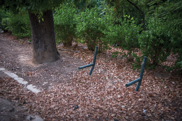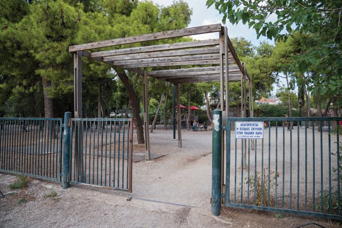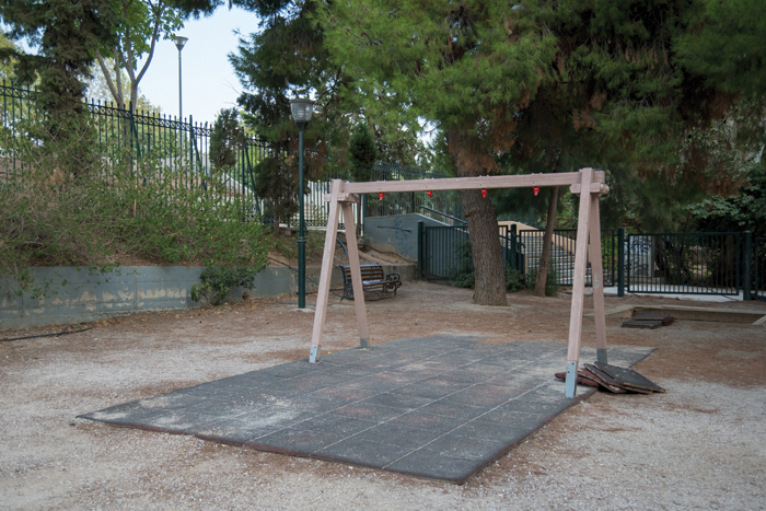 Οι δύο παιδικές χαρές του πάρκου εγκαινιάστηκαν τον Απρίλιο. Κατά τις 6 το απόγευμα στη μεγάλη υπήρχαν πάνω από 20 μαμάδες με τα παιδιά τους. Η μισή πόρτα έλειπε. Και όλες οι κούνιες, μαζί με τις αλυσίδες. Είχε μείνει μόνο ο σιδερένιος σκελετός από όπου κάποτε κρέμονταν. «Τα κλέβουν όλα. Βλέπεις που πολλά παγκάκια είναι ξηλωμένα; Τους βάζουν φωτιά για να ζεσταθούν. Κάτσε να χειμωνιάσει και δεν θα μείνει ούτε ένα παγκάκι» λέει η κ. Αντωνιάδου.