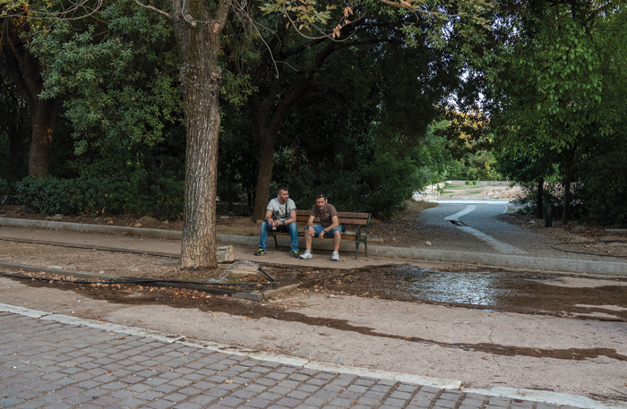 Το βράδυ στο πάρκο είναι λίγο τρομακτικά – το φως είναι ελάχιστο. Κι αυτό με τη φύλαξη σωστό είναι, γιατί αν χρειαστεί κανείς κάτι, δεν υπάρχει κάποιος να απευθυνθεί. Το πράσινο όντως δείχνει σε καλή κατάσταση, όμως οι φθορές σε διάφορες υποδομές, σε βρύσες, φώτα, παγκάκια, στα πλακάκια κάτω, είναι φανερές. Έχω την εντύπωση, όμως, ότι το βασικότερο «πρόβλημα» όσων διαμαρτύρονται είναι οι τοξικοεξαρτημένοι. Η αλήθεια είναι ότι οι περισσότεροι περαστικοί θα το σκεφτούν δυο φορές να μπουν από το άγαλμα του Κωνσταντίνου. Ο Σωτήρης Παπαδόπουλος μου έλεγε ότι η κάθε πιάτσα μοιάζει με ένα μπαλόνι γεμάτο νερό. Αν το κρατήσεις στην παλάμη σου και το σφίξεις, θα αρχίσει να ξεχειλίζει από τα δάχτυλά σου για να βρει διέξοδο. Το «μπαλόνι» συνήθως αρχίζει να ξεχειλίζει ύστερα από αντιδράσεις περιοίκων, καταστηματαρχών κ.λπ. Και μεταφέρεται 500 μέτρα παραπέρα μέχρι να περάσουν δυο τρία χρόνια, να ξεχειλίσει ξανά και να πάει άλλα 500 μέτρα πιο πέρα, κάνοντας κύκλους στην πόλη. Μια φορά κι έναν όχι πολύ μακρινό καιρό σε μια γειτονιά (Μενίδι) μάζευαν τους χρήστες με ένα βανάκι (η αστυνομία) και τους άφηναν πολλά χιλιόμετρα μακριά, «αποτρεπτικά», μήπως και ταλαιπωρηθούν πολύ και το ξανασκεφτούν να πάνε από εκεί. Την ίδια περίπου εποχή, ένας χώρος που είχε ανοίξει ο ΟΚΑΝΑ, ο «Οδυσσέας», όπου μπορούσε κάθε χρήστης να πάει να κάνει χρήση εκεί, μακριά από τα μάτια του γείτονα ή του περαστικού που «μετά από αυτό τα είδε όλα στη ζωή του» και κοντά σε γιατρό, για περίπτωση overdose κ.λπ., έκλεισε, λέει, γιατί δεν υπήρχε το κατάλληλο νομοθετικό πλαίσιο. Κι ο καθένας διαλέγει ό,τι του κάνει.