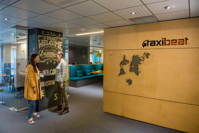 Αγαπητό πια στους Αθηναίους και με μεγάλο στόλο αυτοκινήτων, εμπνέει τη γρηγοράδα και τη ζωντάνια του και εκεί όπου χτυπάει η καρδιά του: Τα κεντρικά του γραφεία βρίσκονται στο κέντρο της Αθήνας, στο νούμερο 11 της οδού Σίνα, διαμορφωμένα με το πραγματικό, νέο-μοντέρνο στιλ μιας startup εταιρείας. Άλλωστε το «beat» στην περιοχή είναι αμείωτο, καθώς βρίσκεται ανάμεσα στη Νομική της οδού Σόλωνος και σε όλη την κινητικότητα των μπαρ της Σκουφά, και αυτό είναι το κύριο πνεύμα που κυριαρχεί στο σχεδιασμό και την ατμόσφαιρα. Τα γραφεία του Τaxibeat καταλαμβάνουν 3 ορόφους σε ένα κτίριο που, κυρίως, στέγαζε δικηγορικά γραφεία. Ο κάθε όροφος έχει τη δική του διαφορετική προσωπικότητα που, κατά κάποιο τρόπο, εκφράζει και τα τρία κεφάλαια της εταιρείας: management, IT και design.