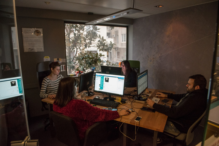 Στην κορυφή, στον 3ο όροφο, βρίσκονται τα γραφεία των δύο από τους 3 επικεφαλής, του Νίκου Δρανδάκη και του Κωστή Σακκά (Senior Software Engineer) και οι servers της εταιρείας (από την αρχική ομάδα των 4 έχει αποχωρήσει ο Νίκος Δαμηλάκης). Στον 2ο είναι το γραφείο του Μιχάλη Σφιχτού (Head of Desing) και της υπόλοιπης ομάδας του και στον 1ο, βρίσκονται τα γραφεία όπου συμβαίνει όλη η ακατάπαυστη επικοινωνία με τα δικτυωμένα ταξί, τους πελάτες, τα αναμμένα μόνιτορ που καταγράφουν τις διαδρομές (υπάρχει ακόμα και το αποτύπωμα της πρώτης διαδρομής που έκανε το taxibeat). Ένα σιωπηλό βουητό που τρέχει σε οθόνες. Μπροστά τους το staff, νέες, έξυπνες φάτσες. Πολλά μούσια. Noserings. Μοντέρνες ιντερνετικές λέξεις. Μία συνάδελφός τους από το Περού, σε training. Ο designer, η υποδοχή. Σε ένα άλλο τραπέζι συμβαίνει μία συνέντευξη.