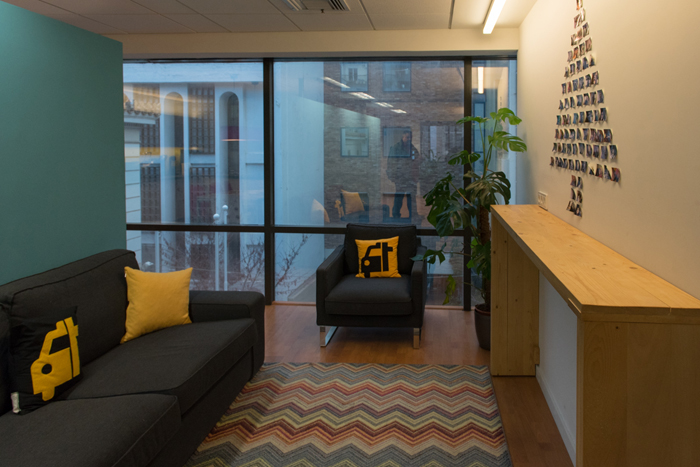 Στο ισόγειο βρίσκεται η υποδοχή για τα νέα μέλη και οδηγούς ταξί που ενδιαφέρονται για την εφαρμογή. Οι δύο γυάλινες επιφάνειες της γωνίας του κτιρίου γίνονται μία τεράστια βιτρίνα μεταξύ ισογείου και πρώτου ορόφου. Εκεί υπάρχει ένα «χωρίς πάτωμα» κενό στο οποίο έχει απλωθεί ένα μεγάλο, τετράγωνο, μαύρο δίχτυ σαν τραμπολίνο ή σαν αιώρα με σκόρπια μαξιλάρια που σε εκλιπαρεί να καθίσεις επάνω του.